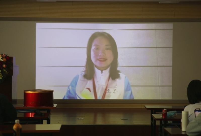 龙媛由于当天正在参与学校表彰活动的筹备工作,无法来到现场,因此她通过视频的形式讲述她的冬奥故事。龙媛担任国家游泳中心志愿者领域志愿者,通俗来说,就是志愿者的志愿者。志愿者之家维护、宣传拍摄、物资分发等有关志愿者保障的事务都是他们的工作。从隆冬腊月到春暖花开,从早上6点到晚上11点,他们坚守在岗位上,积极改进志愿服务方法,为志愿者们提供贴心的服务保障。龙媛还分享了他们与奥运冠军任子威隔空互动的故事。在任子威领奖退场时,马路对面的冰立方志愿者欢呼雀跃,自发唱起《歌唱祖国》。任子威听到歌声后感动落泪,并大声回应志愿者:“你们唱的真好听”,还与志愿者留下了隔着马路的大合影。这个隔着马路的互动,正体现着当代中国青年最有朝气、最赤忱、最爱国的面貌。