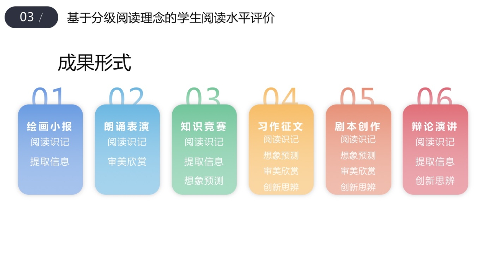 江苏省苏州市平江实验学校语文教师梅佳祺进行了《基于分级阅读理念的学生阅读水平评价》的主题分享,认为基于分级阅读理念的学生阅读水平评价价值在于明晰了阅读的水平,指明了阅读的方向,提升了阅读的能力。从评价原则、评价内容、评价方式、成果方式四个方面介绍了基于分级阅读理念对学生的阅读水平进行评价的主要做法以及成效。