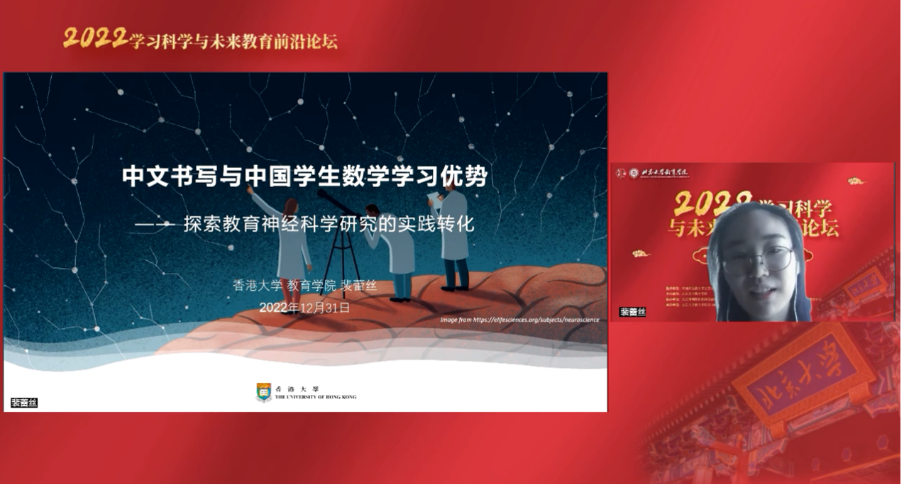 12月31日上午,大会主论坛的学术报告继续进行,由北京大学学习科学实验室的高理想老师和河南大学的梁林梅教授主持。首先,来自天津师范大学教育学院的刘哲雨副教授为我们带来了名为《自我调节学习支架促进深度学习的脑机制研究》的报告。刘哲雨副教授从该团队深度学习的研究历程出发,简要介绍了深度学习相关的基础理论研究、促进深度学习的路径研究,重点介绍了深度学习中自我调节的脑机制研究,并且提出了自我调节学习支架的相关设计规则。接着,香港大学教育学院的裴蕾丝博士进行了《中文书写与中国学生数学学习优势——探索教育神经科学研究的实践转化》的精彩报告。裴蕾丝博士首先分析了教育神经科学研究的发展与困境,简要介绍了主流的神经科学技术与研究范式,最后重点介绍了中文书写与中国学生数学学习优势的脑科学研究,提出了中文书写可能促进数学学习的神经机制。