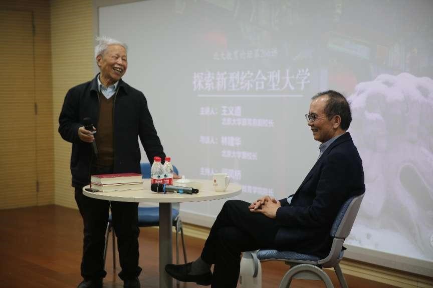 王义遒从上述四个部分讲述了北大探索综合型大学的过程。随后,林建华教授就“探索新型综合型大学”分享自己的看法。他提到,丁石孙、王义遒等老一辈校领导为北大的发展指引了方向、做出了巨大的贡献。进入21世纪后,学校沿着丁石孙等老一辈校领导的大方向,进一步研究部署,认为北大在学科布局上的新增长点,应当是前沿和交叉学科。因此,在“985工程”二期中,学校提出了“以队伍建设为核心,以交叉学科为重点,以体制机制创新为动力”的建设方针。随后,林建华校长从欧美的高等教育出发,提出中国办综合型大学既要立足基本国情,有自己的特色,也要做好与国际顶级学府相同的基础工作,尤其是要注重学生批判思维和创造能力的培养,提升学生的研究能力和学校为社会服务的水平。林建华校长指出,今天是一个知识开放性的时代,教育工作者要结合时代特征,认真思考如何办好综合型大学这个问题。