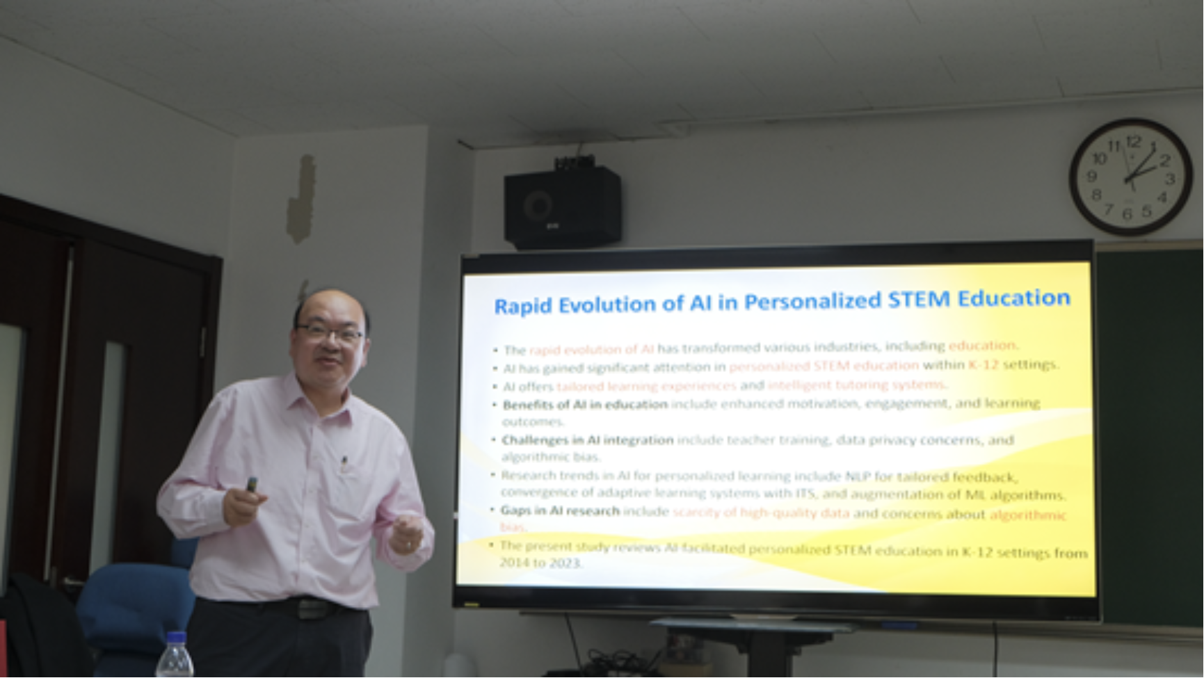 第一场讲座中,杨良河教授进行了主题为《AI支持的个性化STEM教育研究趋势:系统综述和内容分析》的报告,通过文献综述的方法分析了AI推动K12中STEM教育的研究主题、在个性化STEM教育中占据主导地位的AI工具及其如何在K-12教育中应用和体现、AI赋能的个性化K12中STEM教育研究的优势和局限性。当前的AI工具集中于学习行为预测、ITS、项目学习和协作学习机器人等,与情感相关的研究关注学生的态度、动机、兴趣、感知等,对学生的通用技能则关注于计算思维、算法思维、实践思维等,因此未来的教育可以更多关注STEM教育中的数学和工程能力、21世纪技能和学生投入及自我效能感。杨教授也介绍了他们最近的其他研究,包括图片提示写作任务的自动评分模型、有自动反馈的图片提示写作网站、GPT支持的语言学习、个性化的虚拟教师等。