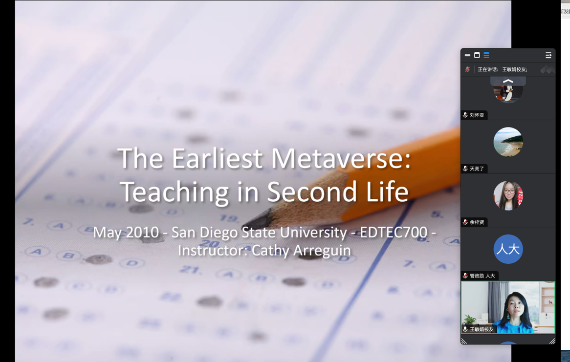 2023年12月12日下午,北大教育论坛第280讲在腾讯会议线上举行。美国加州圣地亚哥州立大学学习设计与技术系(LDTech) 终身教授王敏娟应邀报告,题目为《元宇宙与生成式人工智能工具在教学中的应用》。本次讲座由教育技术系主任贾积有教授主持。来自北京大学和海内外其他高校的200余位师生听取了报告。
