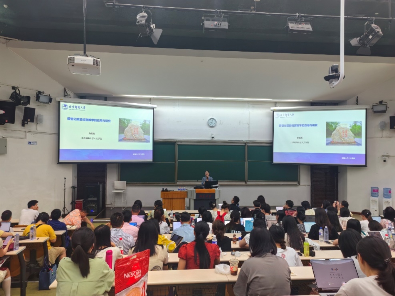 7月11日上午,北京邮电大学人文学院教授、国际处副处长陈真真进行了题为《数智化赋能语言教学的应用与研究》的报告。她概述了数智化语言教学的背景,分析当前数智化语言教学的研究现状,揭示其发展趋势以及在实施过程中遇到的主要挑战;在此基础上,分享了几个数智化语言教学的应用案例,并对其应用成效进行评估。最后,对未来应用及研究提出展望。