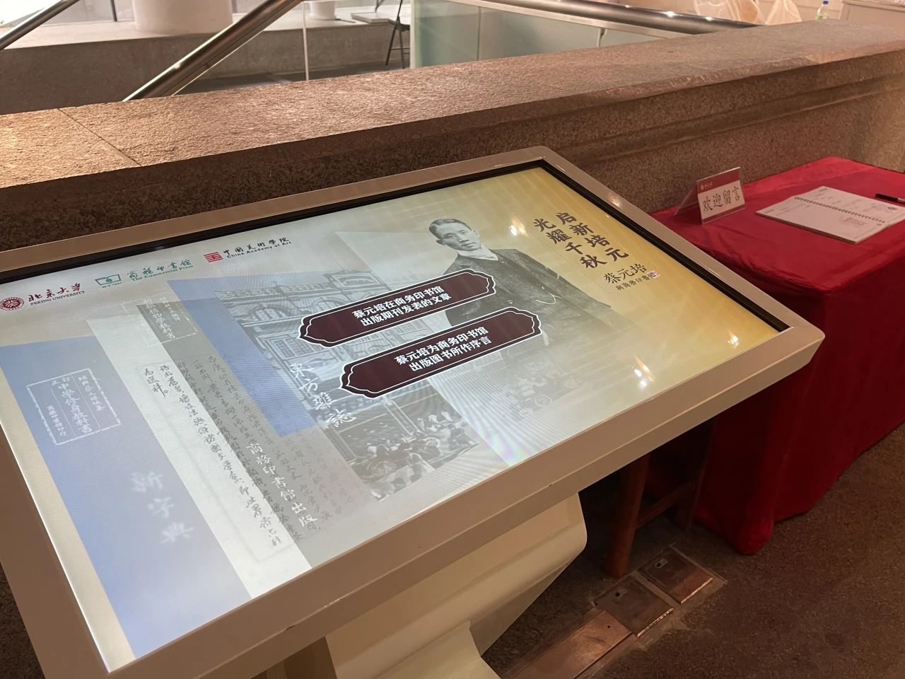 为提升观展体验并深化观众对展品的理解,展览特别采用数字化呈现方式对蔡元培先生的相关文献资料进行延伸展示:其一,通过交互式触摸屏技术,系统呈现蔡元培先生在商务印书馆创办刊物上发表的学术文章及其为商务出版物撰写的序言内容;其二,针对展出的中英文信函、日记等珍贵手稿类文物,配套开发了数字化识读系统,并将权威释文内容制作成二维码标识,观众可通过移动设备扫码获取完整文本信息及背景资料。