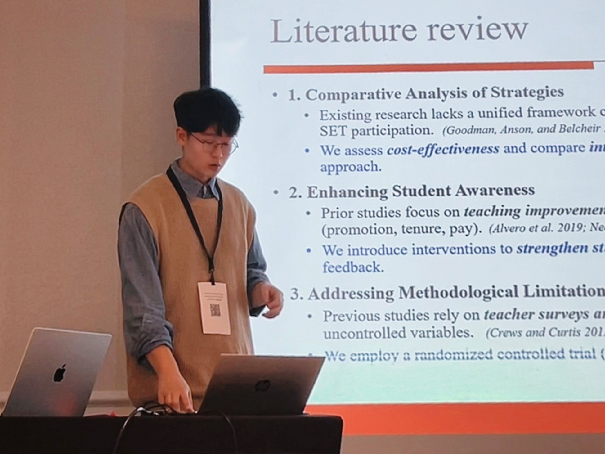 3月14日下午,博士生郑翔睿作题为“The Promotion in Her Mind or the Score in My Hand? Examining Interventions to Increase Student Participation in Evaluations of Teaching”的口头报告。该研究通过随机对照实验,探讨了提升大学生参与教学评估意愿的有效策略。基于对2,179名学生参与评教的动机与障碍分析,研究评估了三种干预措施的效果:提供附加分(外在激励)、增强学生对评教结果影响教师职业发展的认知(内在激励),以及缩短调查时间以减轻倦怠。结果表明,外在激励和内在激励均显著提高了学生的参与意愿,而单纯缩短调查时间则无显著影响。研究还发现,家庭文化资本较高的学生对分数激励更敏感,而教学质量更高的教师在提供内在激励时会获得更多反馈。这些发现揭示了提高学生评教参与率的有效措施及其异质性效应,为高校优化教师教学评估机制提供了重要的实证依据。