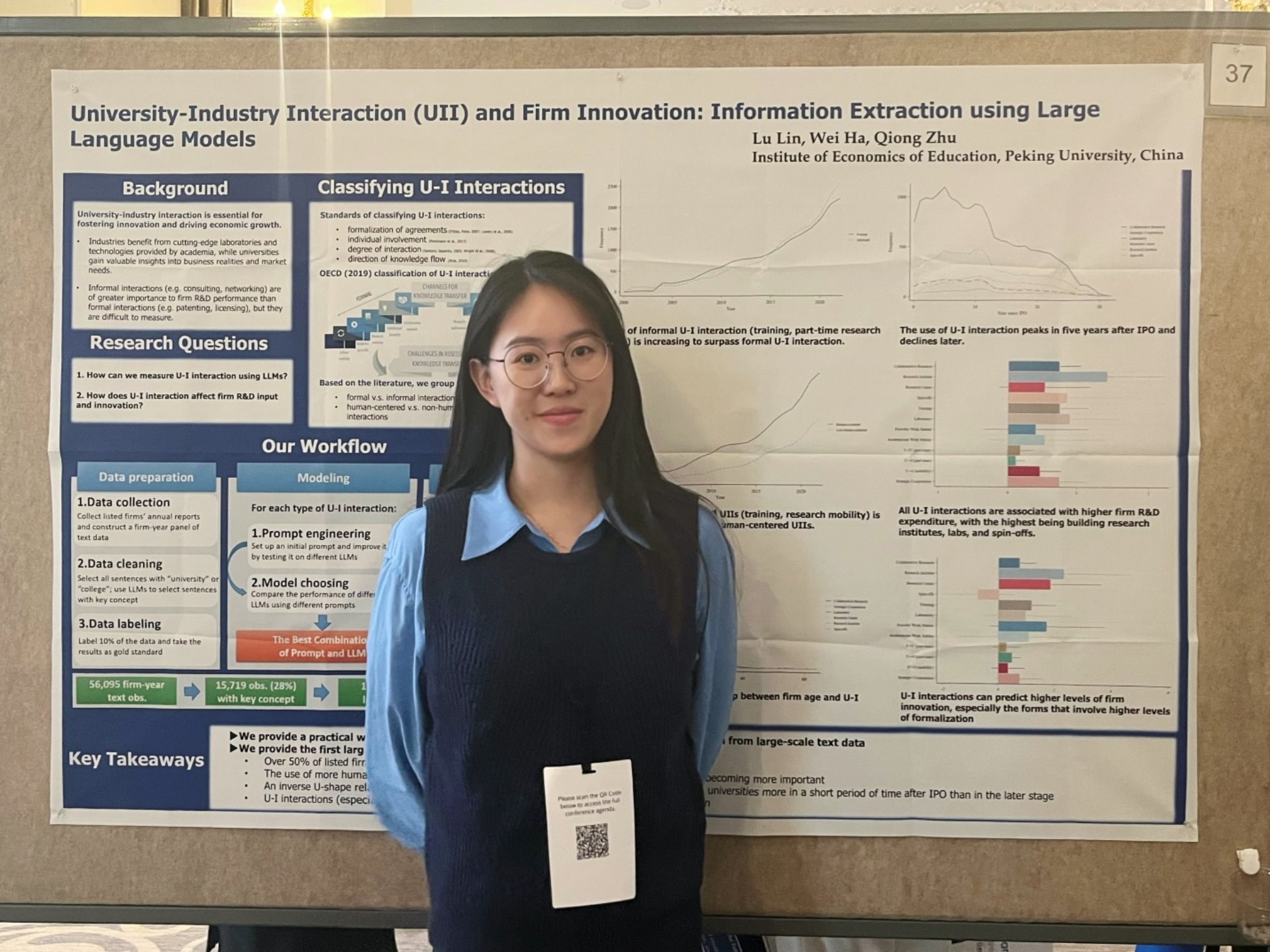 3月13日中午,博士生林璐作题为“University-Industry Interaction and Firm Innovation: Information Extraction using Large Language Models”的海报展示。该项研究运用大语言模型从中国上市公司年报文本数据库中进行信息挖掘,旨在创新性地测量产学研合作的频率及其对企业研发投入与创新产出的影响,并揭示2000年以来中国产学研互动模式的演变趋势。研究发现,2000—2022年,中国上市公司平均每年进行2.3次产学研合作。非正式合作逐渐上升并超过正式合作。以人为中心与非制度化的合作增长快于其他合作。就合作形式而言,共建研究中心、共建实验室和衍生公司与研发投入增加显著相关,共建研究中心与创新产出提升关联最大。研究首次提供了有关产学研合作的系统性实证证据,并展示了使用大语言模型从非结构化文本数据中提取信息的实用工作流程。