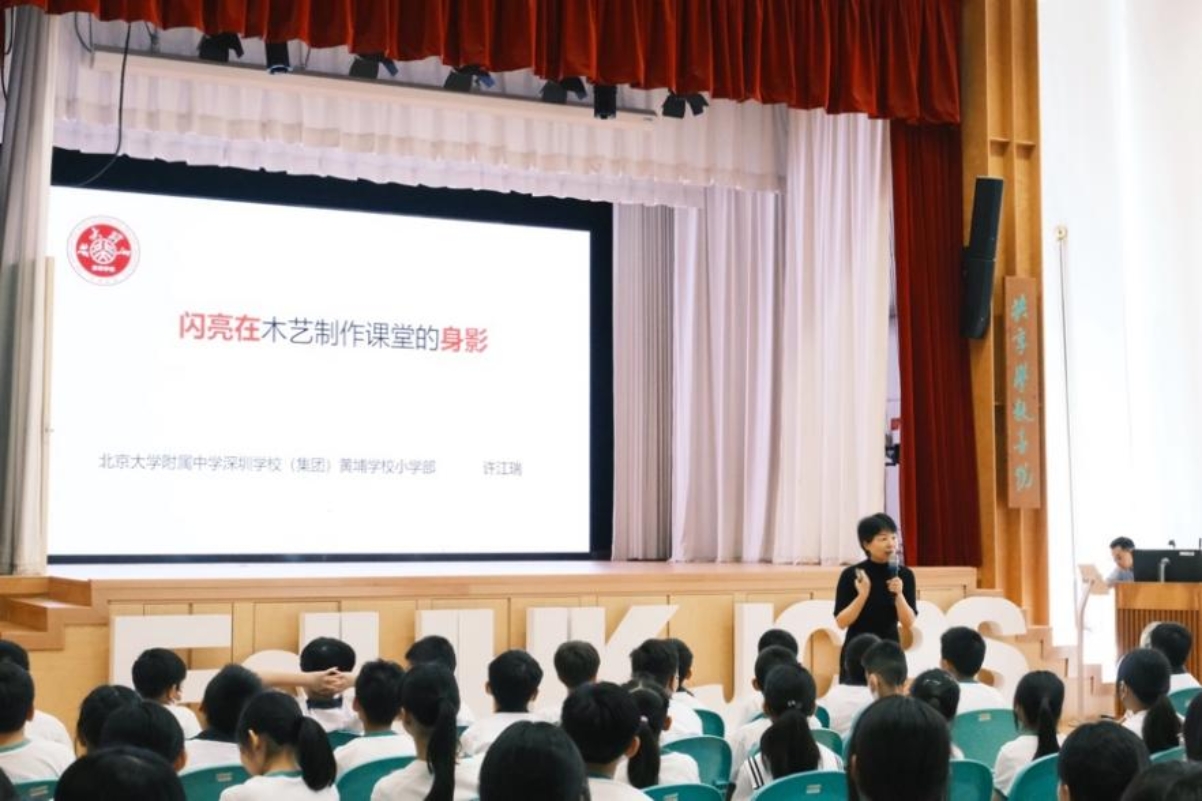 随后在赛马会小学大讲堂,北大附属中学深圳学校(集团)黄埔学校小学部许江瑞主任以“闪亮在木艺制作课堂的身影”为主题,展示了“做中学、用中学、创中学”的理念和项目式教学法在跨学科实践中的应用。旷欣然以“越来越厉害的人工智能”为题,给孩子们介绍了人工智能的最新应用成果。
