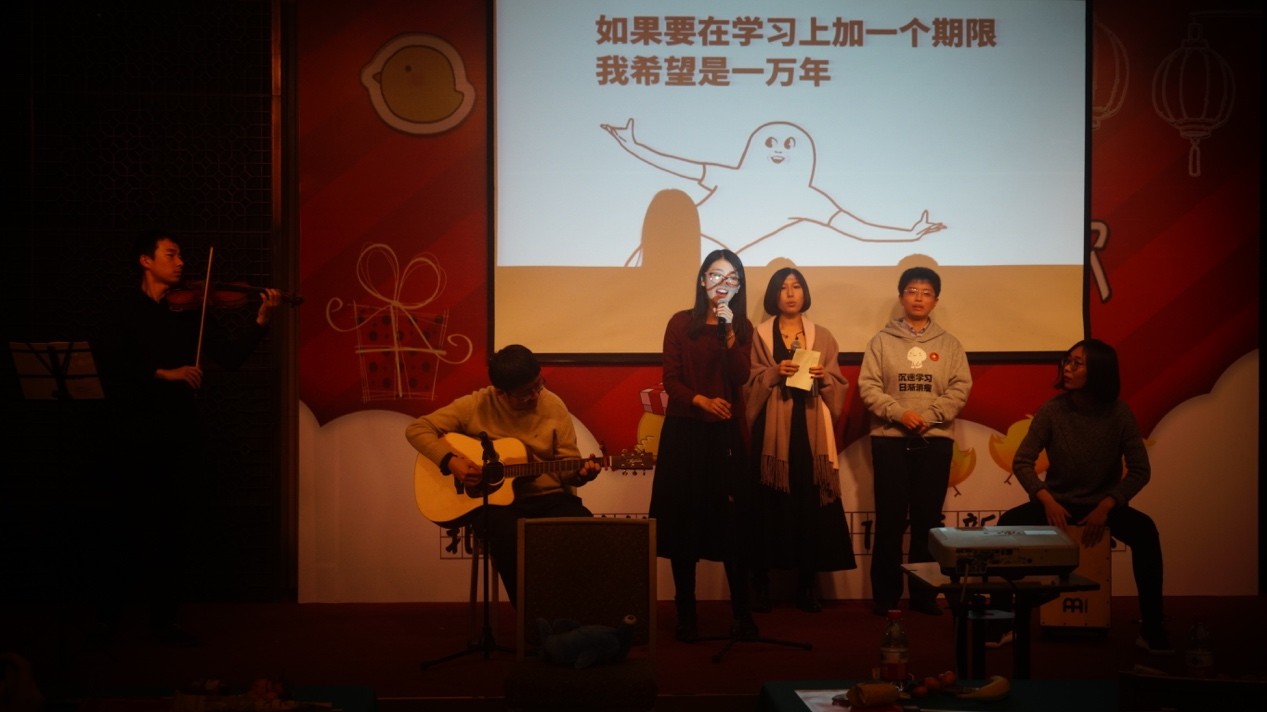 此外,本次新年晚会还设置了互动抽奖环节。三次抽奖分别发放三等奖零食大礼包3份、二等奖榨汁机2台、一等奖kindle1个,引起了同学们的阵阵关注与欢呼。在16级教经硕士生们点燃全场的串烧歌曲《四季歌》中,本次晚会圆满结束,全体师生上台合影留念。