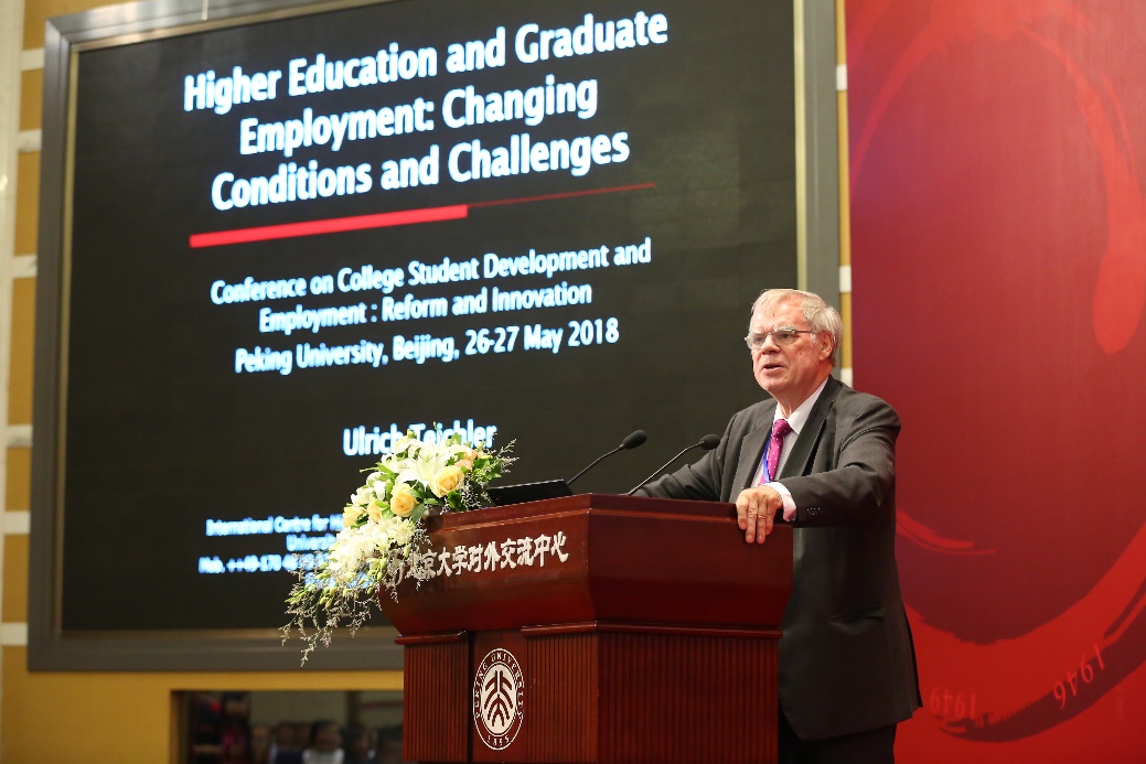2018年5月26日上午,“变革·创新:高校学生发展与就业国际论坛”在北京大学英杰交流中心隆重举行。在为期两天的会议中,来自中国、美国、英国、德国、俄罗斯、意大利、日本、澳大利亚等国家在内的专家学者、国家政策制定者、高校管理者以及商界精英三百余人汇聚一堂,共同探讨高校学生发展、就业与教学改革等重要问题。