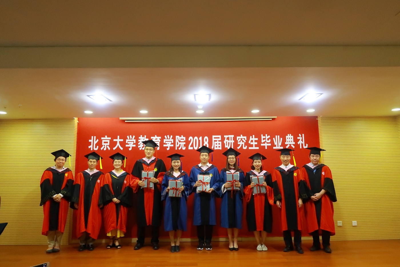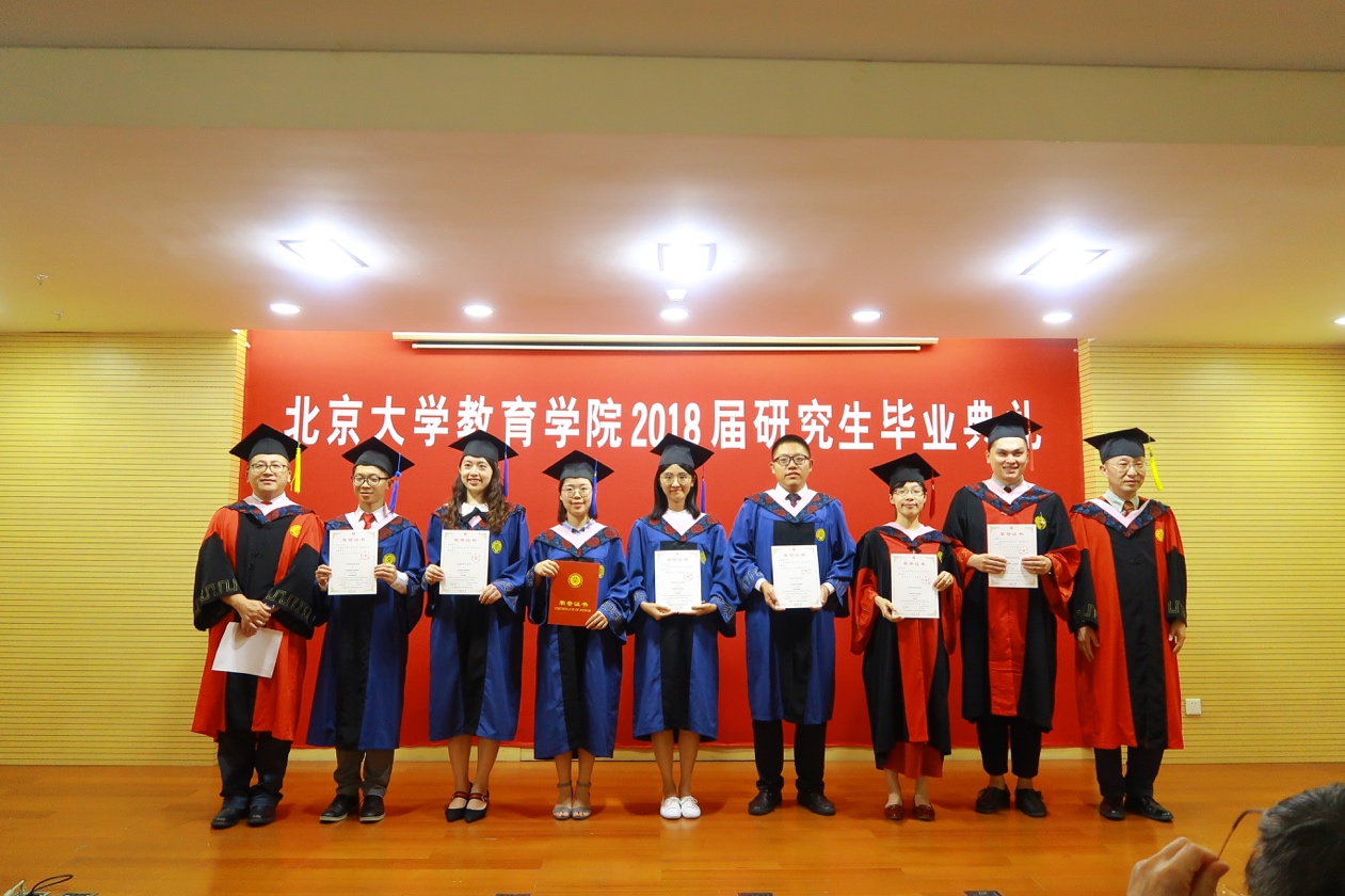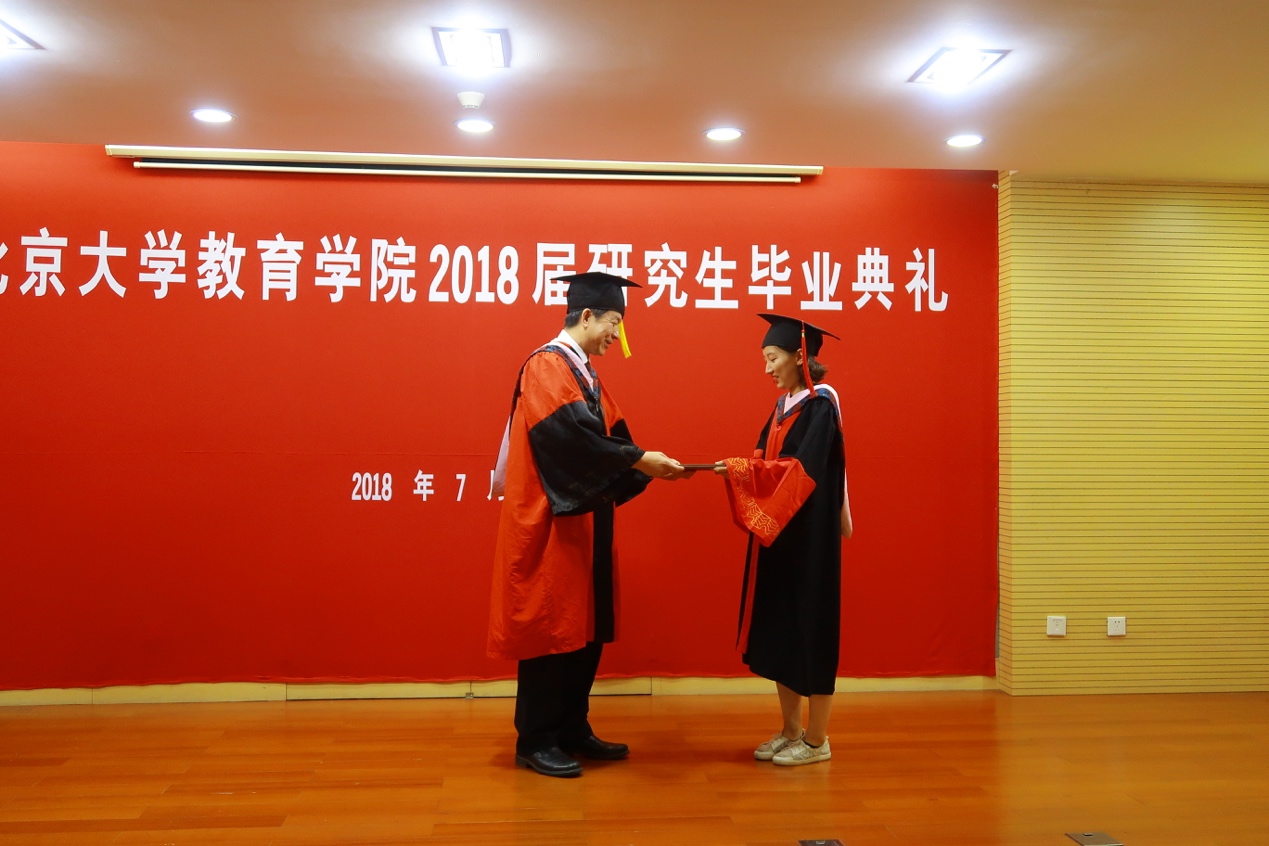 院学位评定委员会主任陈洪捷教授首先介绍了今年毕业生的基本情况,并宣读教育学院2018届获得博士、硕士学位的学生名单。获得学位的毕业生伴随着掌声依次上台,接受师生和亲友们的祝贺。之后,教育学院副院长岳昌君教授宣读了2018年优秀学位论文作者名单,并由院长陈晓宇教授为16位获奖论文作者颁发荣誉证书。