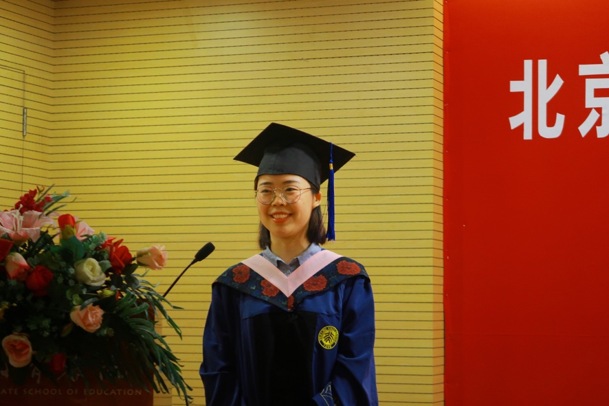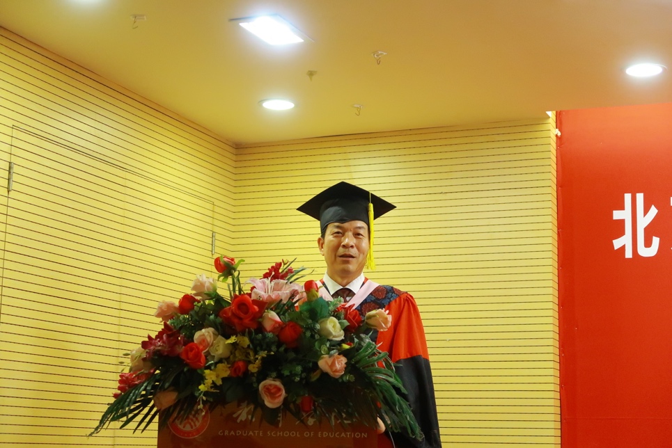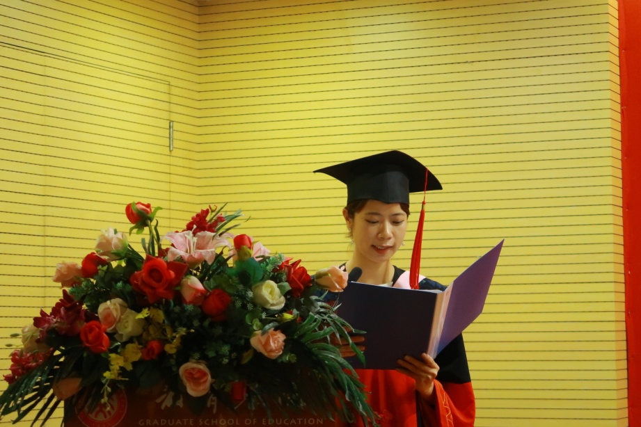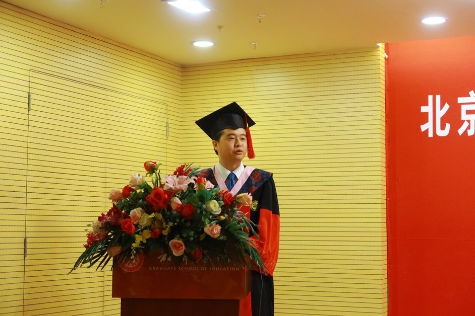 毕业生代表孙永臻、周丽萍、官华分别代表硕士生、博士生和Ed.D.毕业生做了情深意切的发言。他们或讲述在北大求学经历中对于自我选择与社会关怀的思考和探索,为所有毕业生送上独立、坦荡与成为“教育人”的祝福;或以自身经历为例,与全体毕业生一起重温了在教育学院求学、生活的美好回忆;或娓娓道来,真切地表达了对终身学习和对学院老师们的感恩之情。毕业生代表纷纷表示,教育学院老师们的言传身教时刻引领着毕业生,他们也一定会承担起应有的职责,不辜负老师们的殷切期望!
