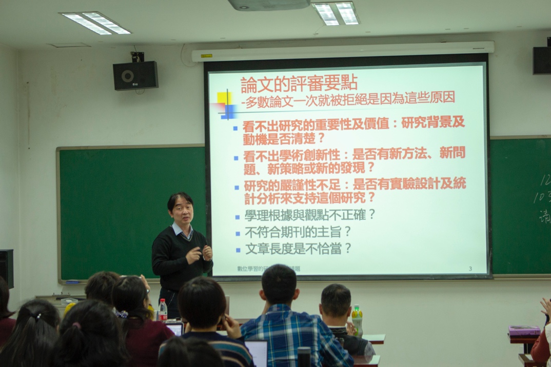 黄国祯教授为大家介绍如何在构思研究的时候增强创新性。他认为好的学术论文和研究必须具备学术价值和创新性这两点,从论文的题目就能看出一篇论文的价值。为此,黄国祯教授和在场的师生展开互动,让大家根据他给出的题目来判断这篇论文是否具有创新亮点,带大家去体会如何去欣赏好的研究主题,分辨研究题目的好坏。这就好比音乐家首先要会欣赏好的音乐才能创造出好的音乐,研究者亦如是。黄教授不仅给大家列举具有创新性研究课题的例子,还讲解如何将普通题目转变为具有创新性的题目,并且强调90%的创新概念来自于旧方法旧策略的重新组织和重新诠释。黄教授最后总结道,想要找到好的研究题目必须要阅读大量文献,了解当前研究趋势,找到研究突破点,保留既有优势,针对现有议题加入新元素。更重要的是,作为研究人员,要时时刻刻把自己的研究放在心里,这样才能随时随地吸纳有用的资料和信息为自己的研究提供灵感。