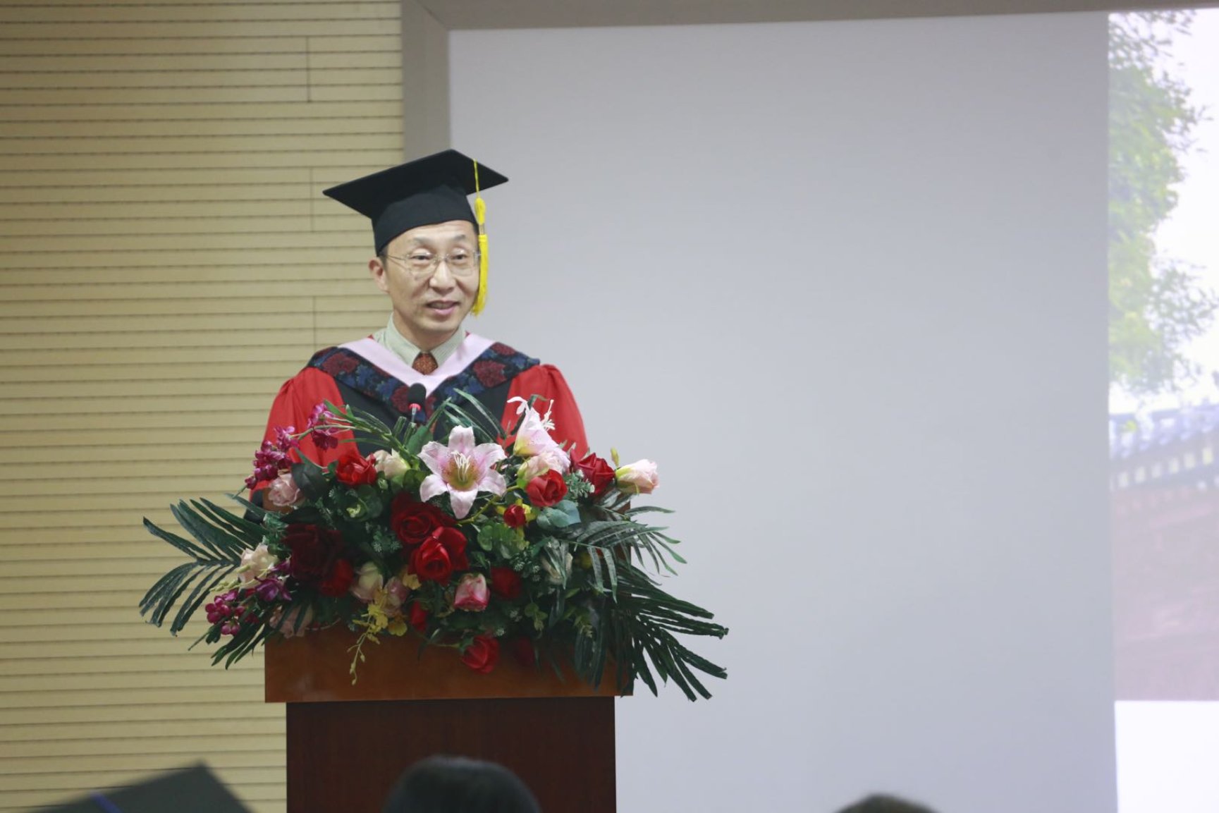 典礼开始前,毕业典礼工作小组播放了由毕业生拍摄、研会制作的毕业视频,回顾了同学们在学院学习和生活的点滴,教师代表在短片中表达了对毕业同学的祝福,随后全场起立,奏唱国歌。