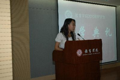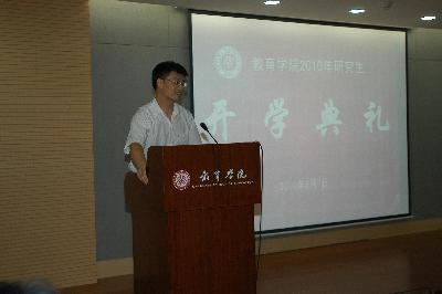 硕士新生代表毕鹏、孙钰,博士新生代表程飞分别在开学典礼上发言,他们表示要砥砺思想,继承北大勤奋严谨求实创新的学风,不断提高综合素质,做一名优秀的北大学子。教育学院2009级硕士研究生、院研究生会副主席原帅代表在校生对新生表示欢迎,并分享了她求学一年的经历与心得,勉励新生要“仰望星空,脚踏实地”。教师代表蒋凯副教授代表学院全体教师欢迎大家加入教育学院的大家庭,并希望大家做一名“德、智、体”全面发展的北大学生。