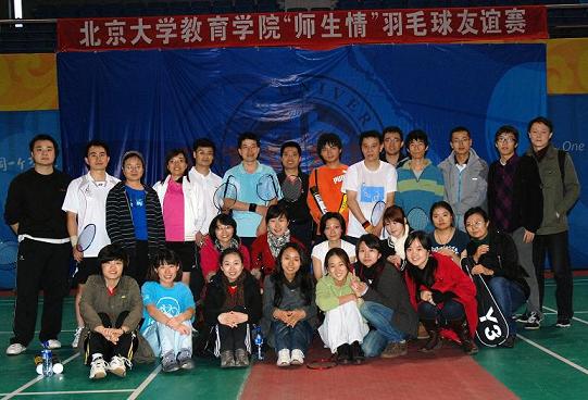 为增进学院师生交流,增强体质,丰富课余生活,2010年10月23-24日教育学院在邱德拔体育馆隆重举行2010年“师生情”羽毛球友谊赛。经过学院团总支和研究生会前期的精心准备与科学策划,遵循师生任意搭配与组合的原则,全院共有38支队伍参加了初赛的单循环赛,16支队伍参加了复赛的淘汰赛。比赛采用初赛单循环赛和复赛淘汰赛形式的混合赛制。